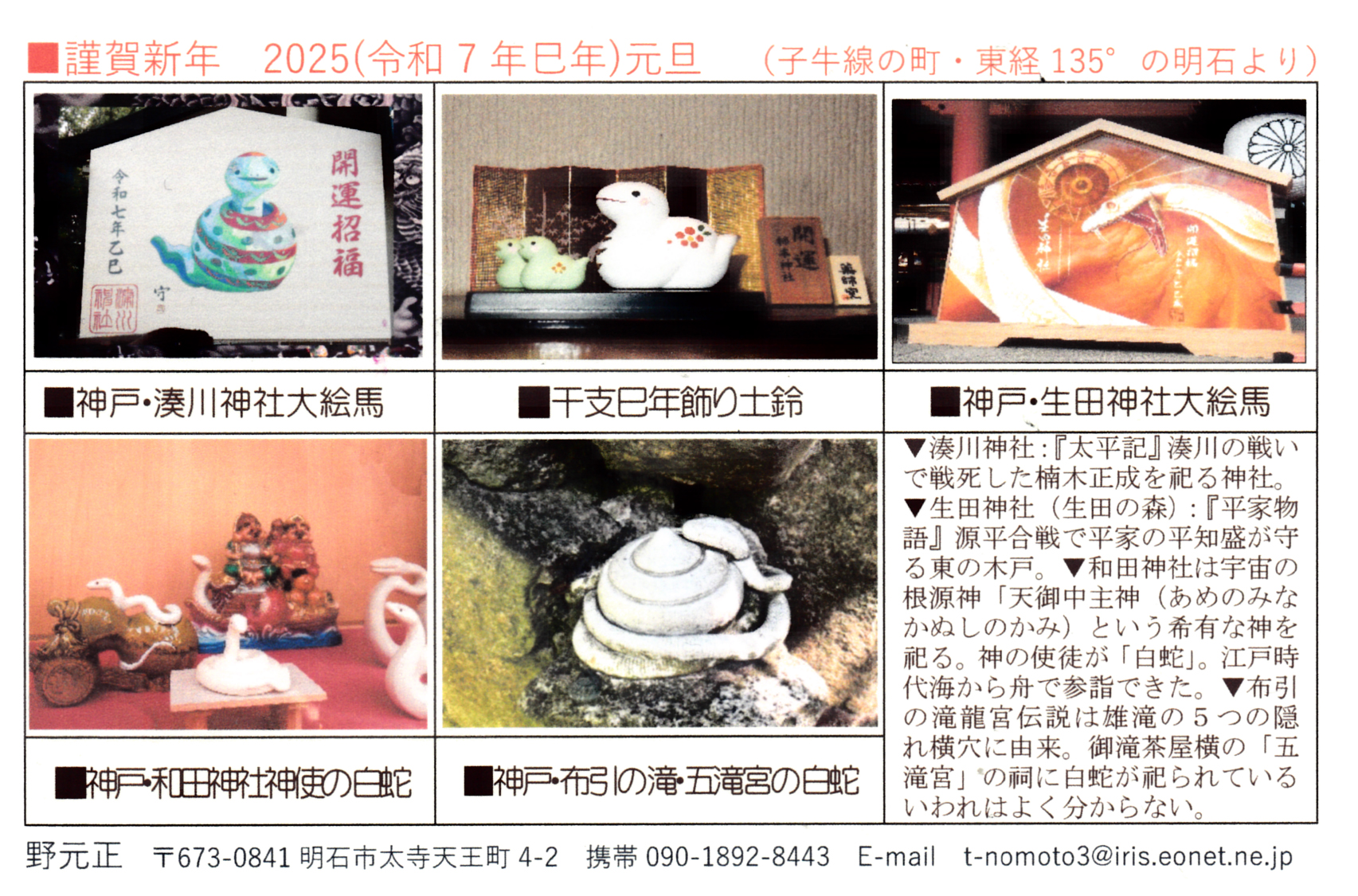 明けましておめでとうございます。 今年はきっといい年になる予感がします。 しばらく休んでいたホームページも再開です。 *文字が小さいので転記します。 ▼湊川神社:『太平記』湊川の戦いで戦死した楠木正成を祀る神社。 |