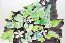 ドクダミの花が裏庭の日陰を好んでひっそりと咲いている。花はこびとの帽子のように見える。白い4枚の花弁状のものは苞で、広辞苑によると「花や花序の基部につく葉」であるという。この白い葉は訪花昆虫を誘うと言われている。私もなぜか白い花と白い日傘をさして丘に立つ白い服の女に惹かれる。モネの絵画が思い浮かぶ。緑色の日傘をさして丘の上に立つ白い服の女のスカーフを風が靡かせて渡る。