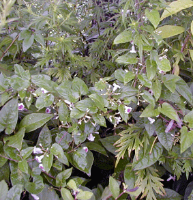 明石太寺 007 ■へくそかずら Paederia scandens (あかね科) 別名サオトメカズラ、ヤイトカズライという。学名までスカンデンスとつけられかわいそう。花が早乙女の帽子に似ているという名の方に愛着を感じる。古くからしもやけの薬として果実が用いられたという。花、葉、果実をもんだり、つぶしたりすると、臭い。 |
