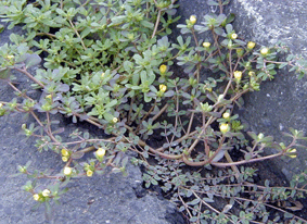 明石城跡への野道 009 ■すべりひゆ Portulaca oleracea 日本全土に生息。日照により開花。おしべに触れると、指先を追う。花期は7〜8月。葉は対生。若い茎葉は食べられる。解毒剤とか? |